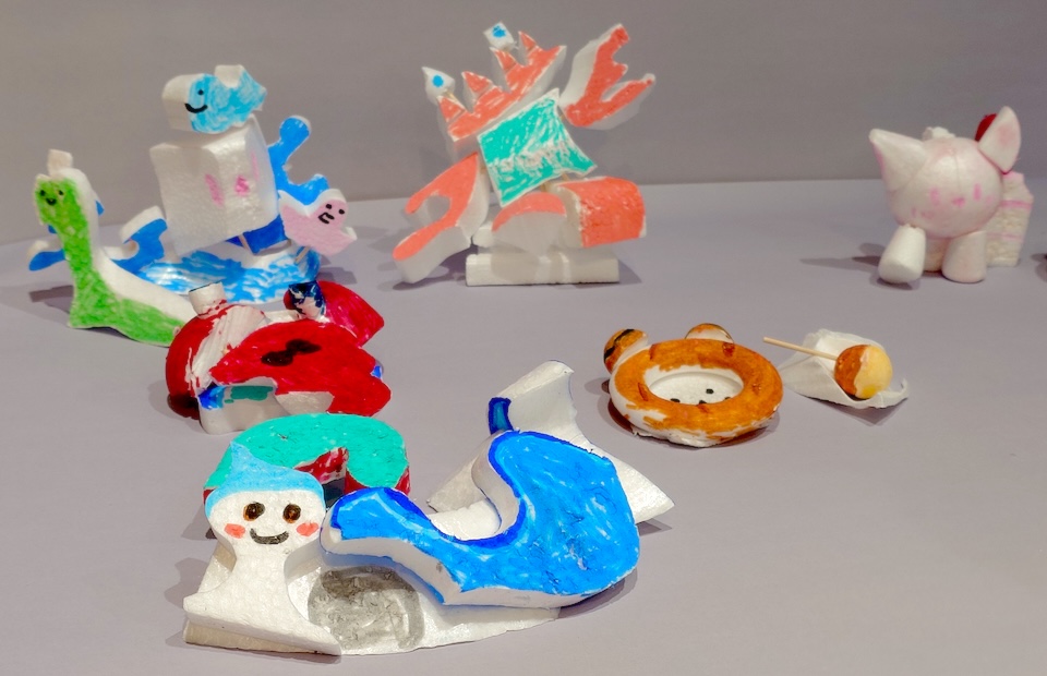 <不思議オブジェ作り> ヘンテコな形の発泡スチロール片を接着したりペイントしたりしてイメージや物語が膨らみ…夢中になると心のデトックスにも。